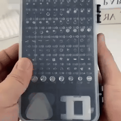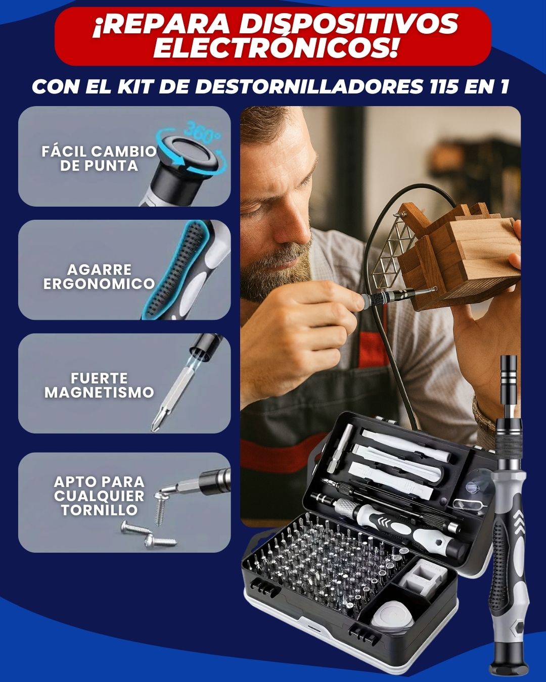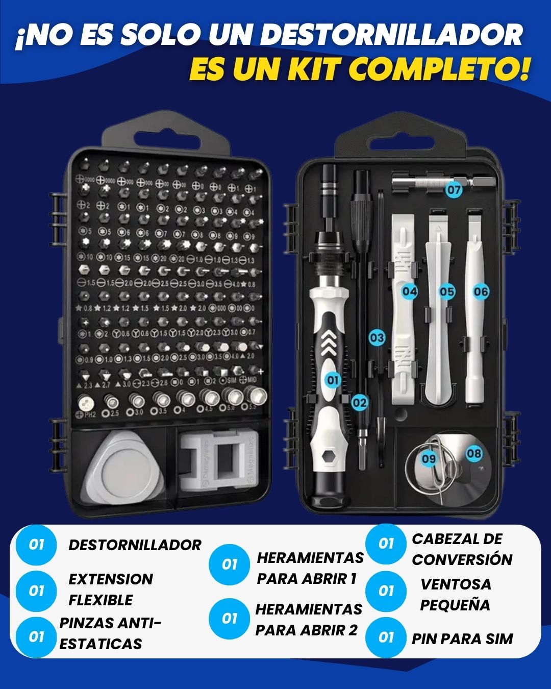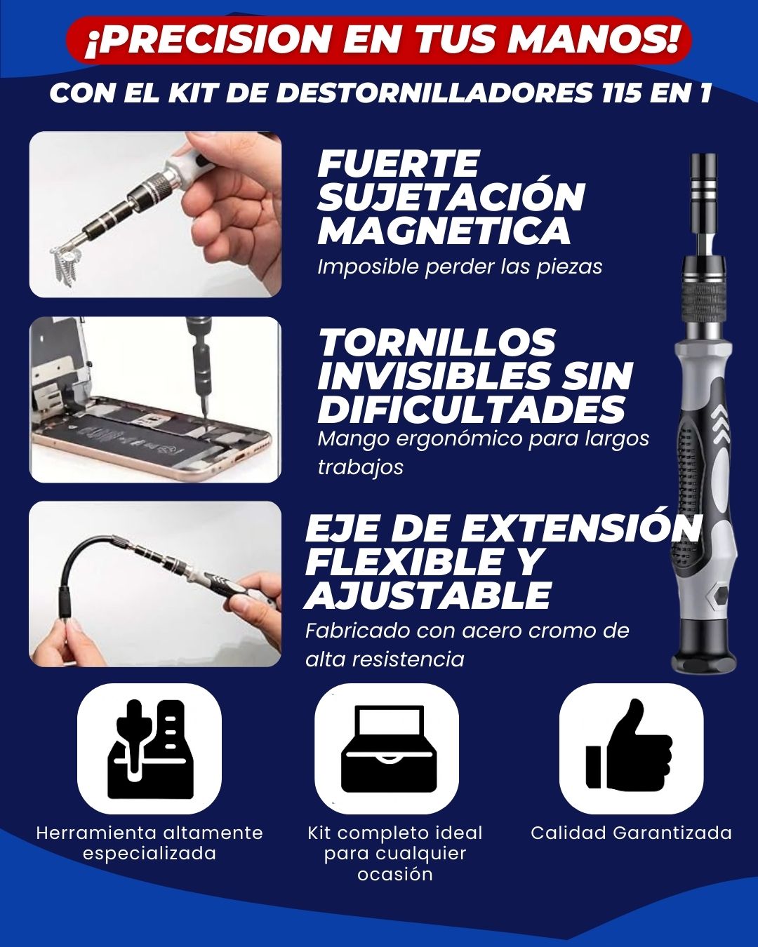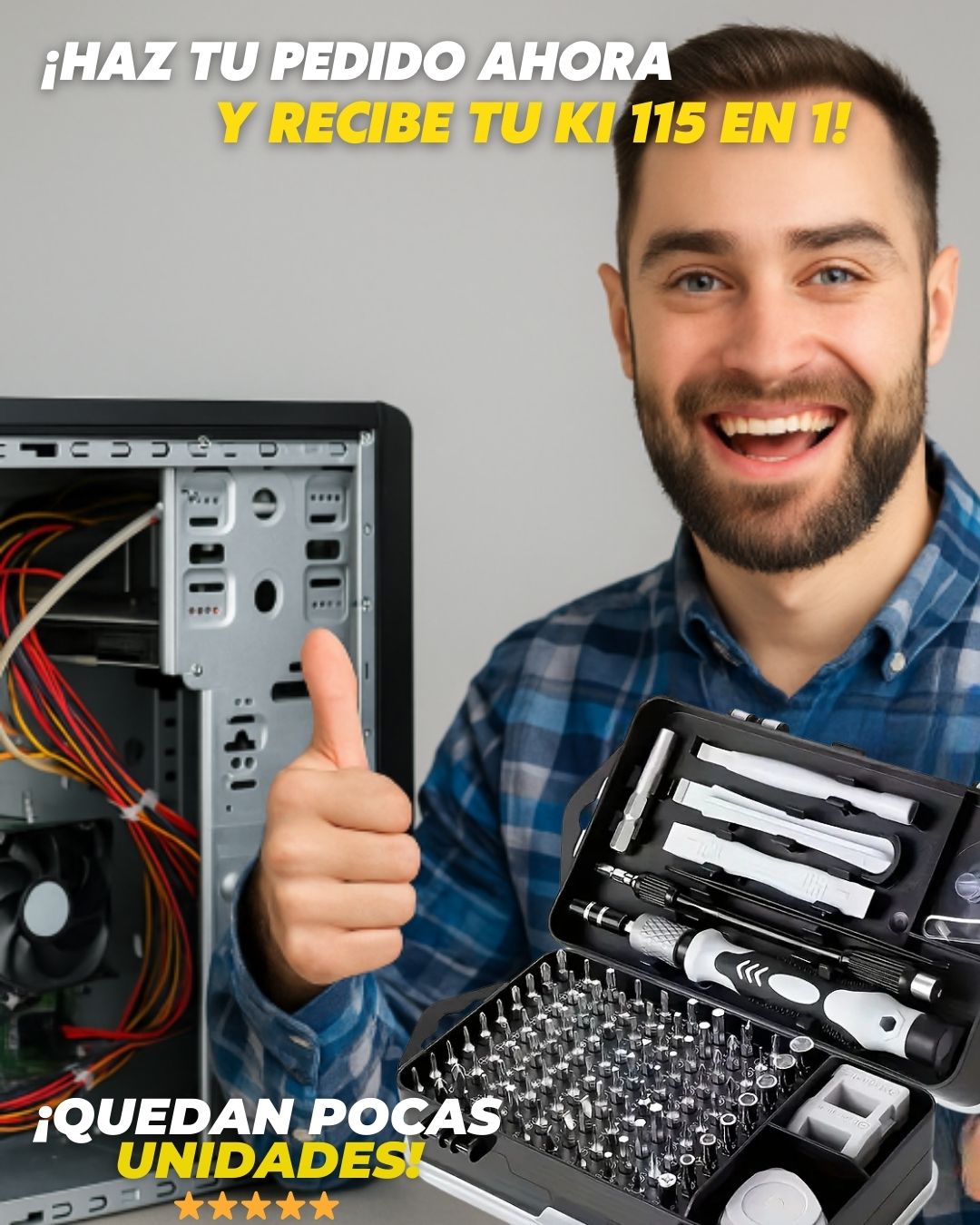 El kit trae 115 piezas: destornillador ergonómico, extensores rígido y flexible, puntas magnéticas para múltiples dispositivos, herramienta para SIM, ventosa, pinzas, palancas plásticas y mucho más. Todo organizado en un estuche portátil y resistente.
