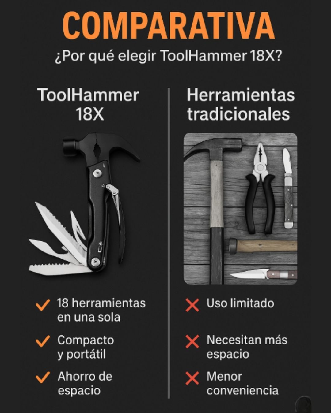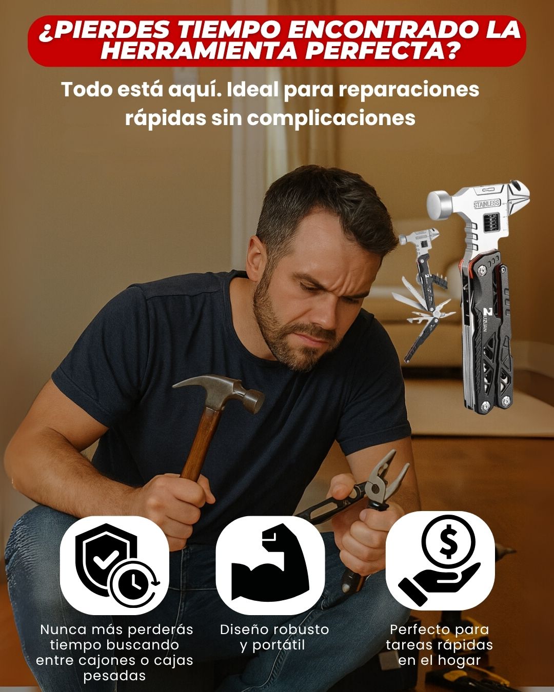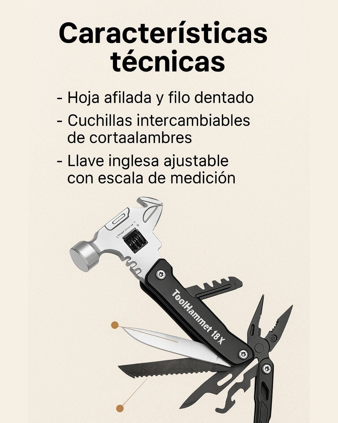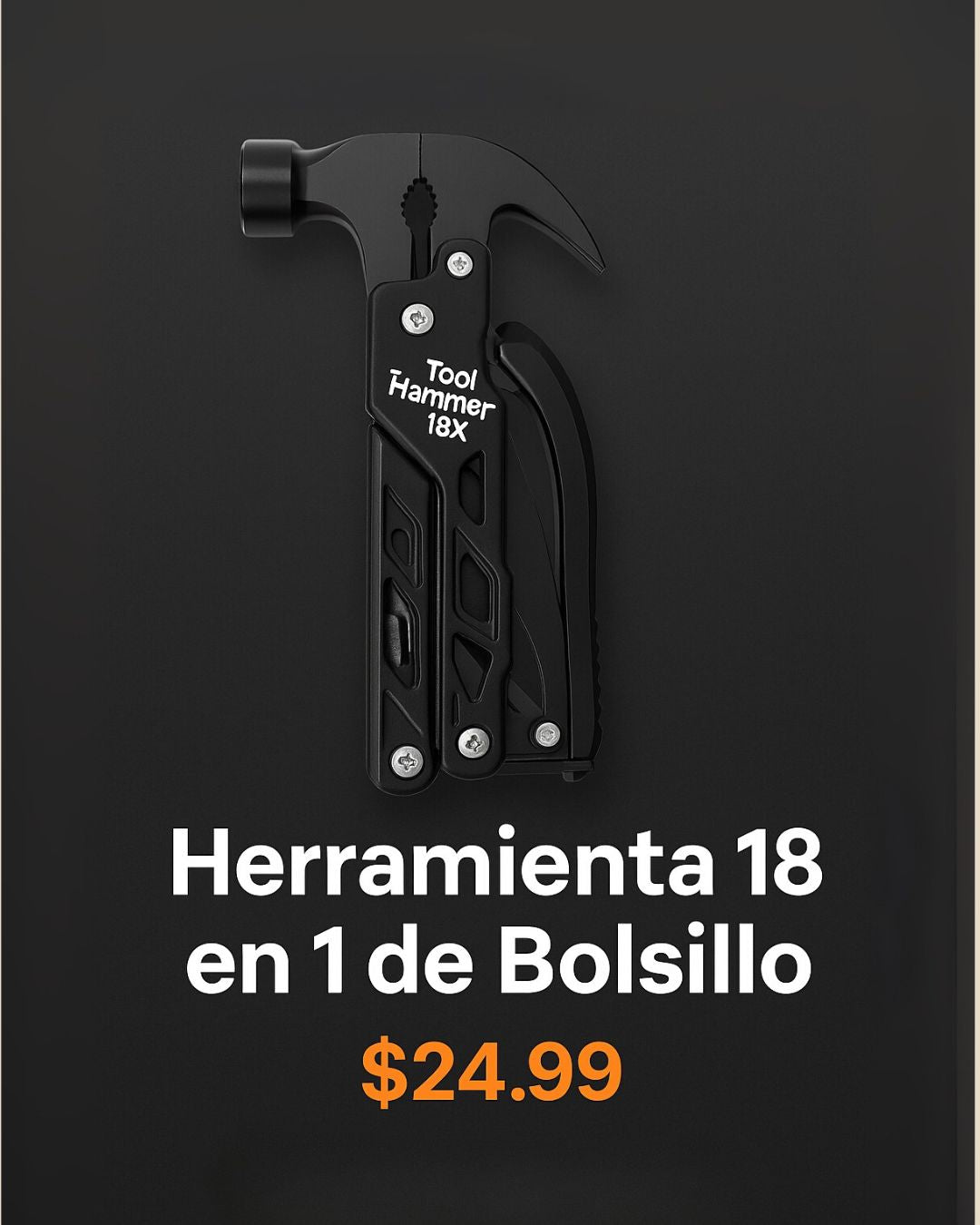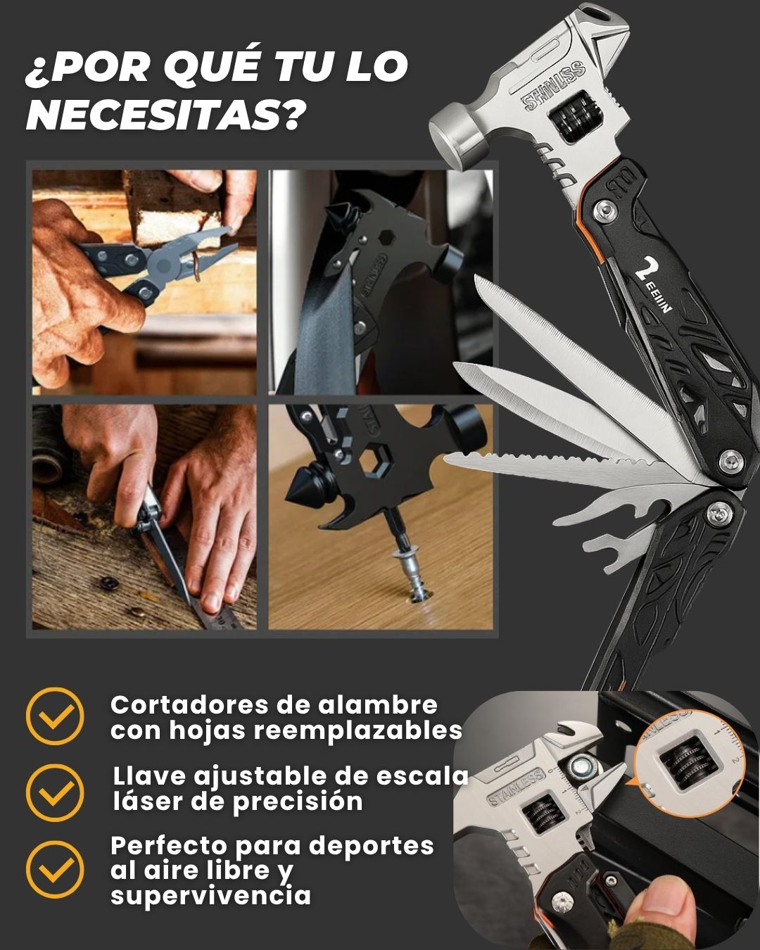 Una herramienta multifunción de acero inoxidable con 18 usos integrados.