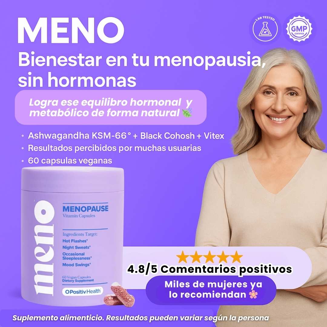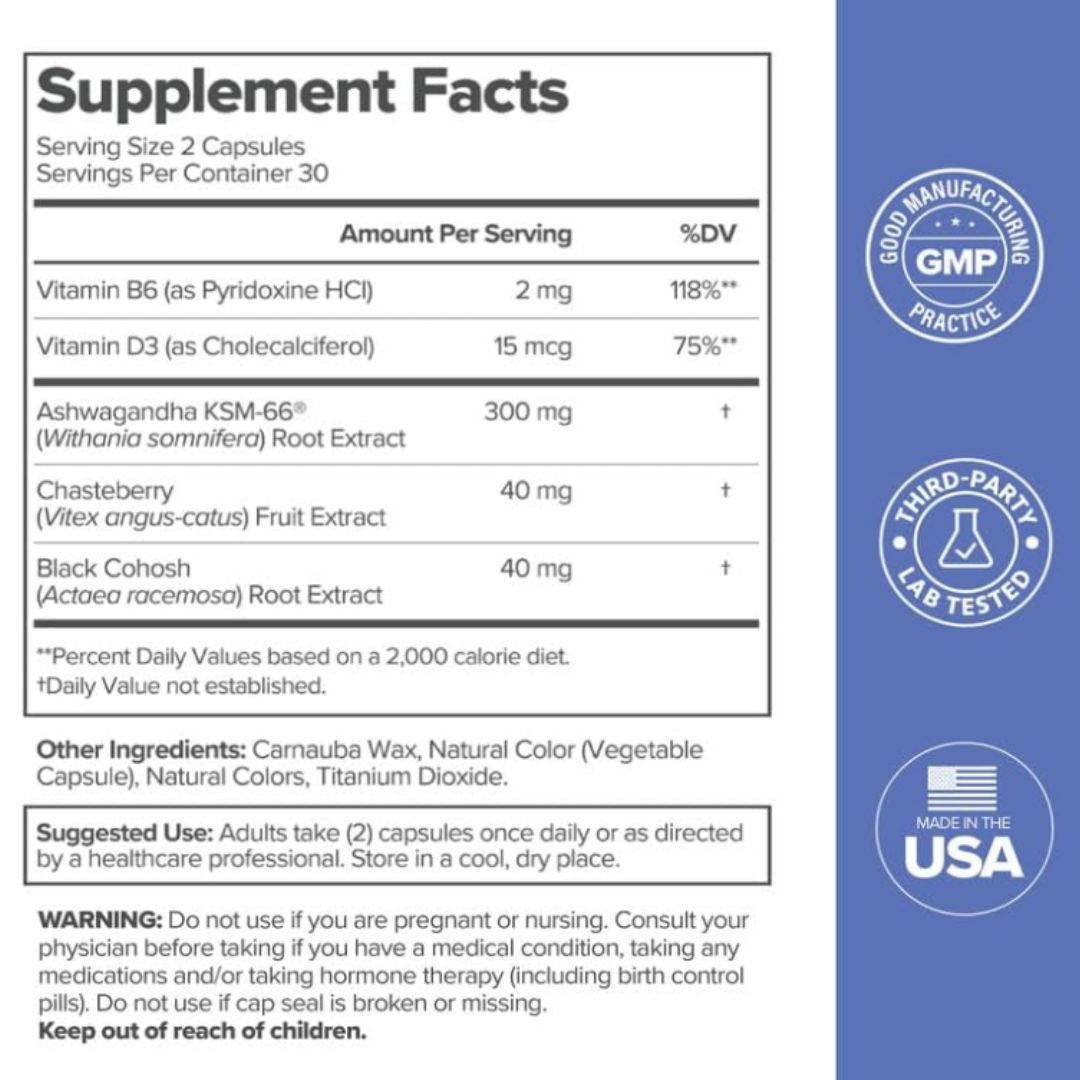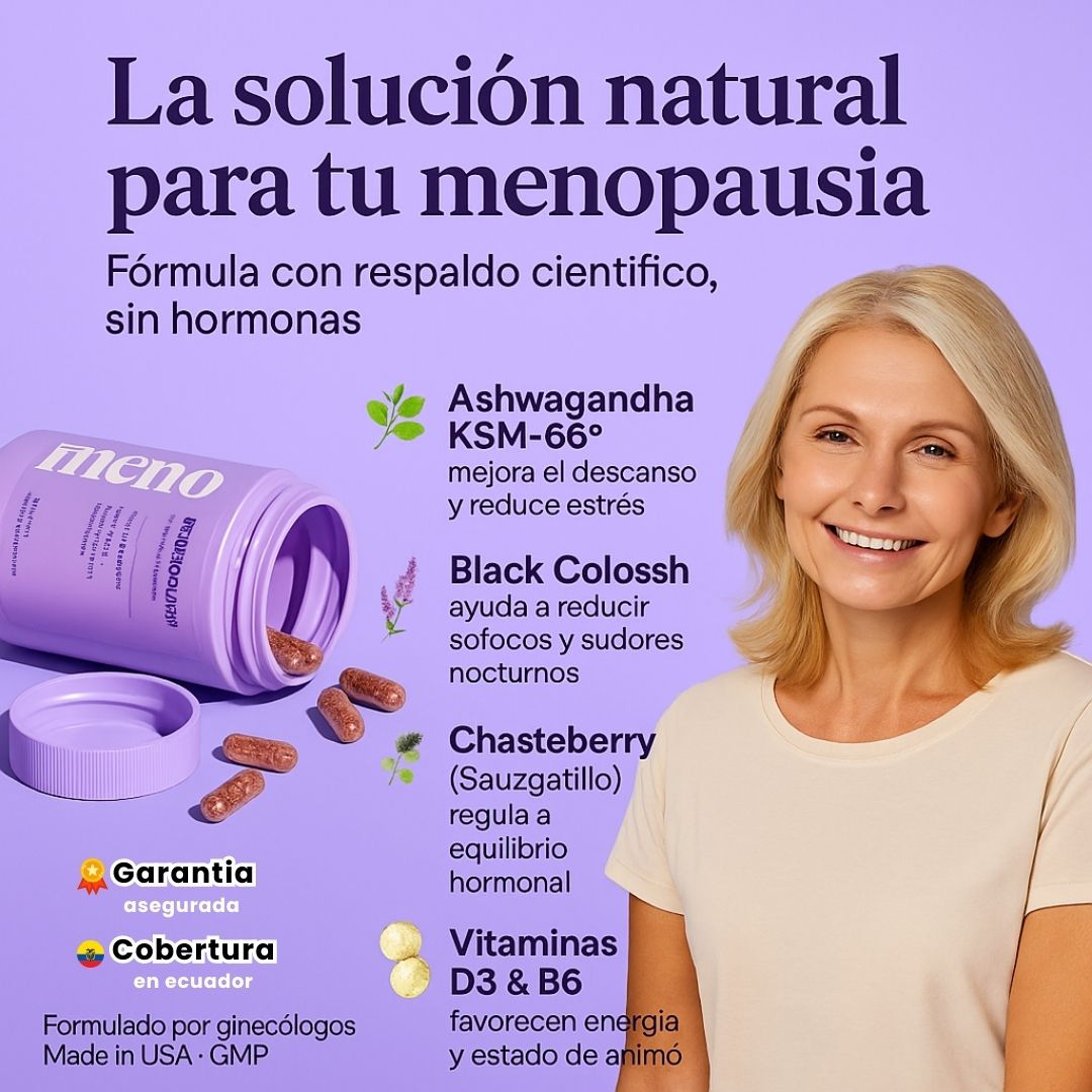 Está formulado con ingredientes naturales como Ashwagandha KSM-66®, Black Cohosh, Sauzgatillo y vitaminas D3 + B6, que han demostrado ayudar a aliviar síntomas comunes de la menopausia como sofocos, sudores nocturnos, insomnio ocasional y cambios de humor.