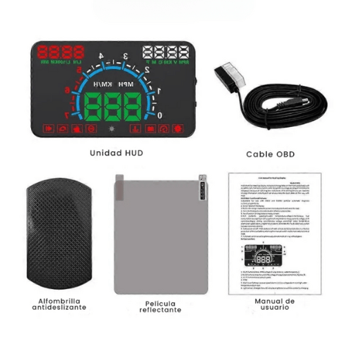 Incluye el dispositivo HUDView™, cable OBD2, cable GPS, película reflectiva, base antideslizante, manual en español, garantía por defectos y soporte. ¡Todo listo para instalar y usar!